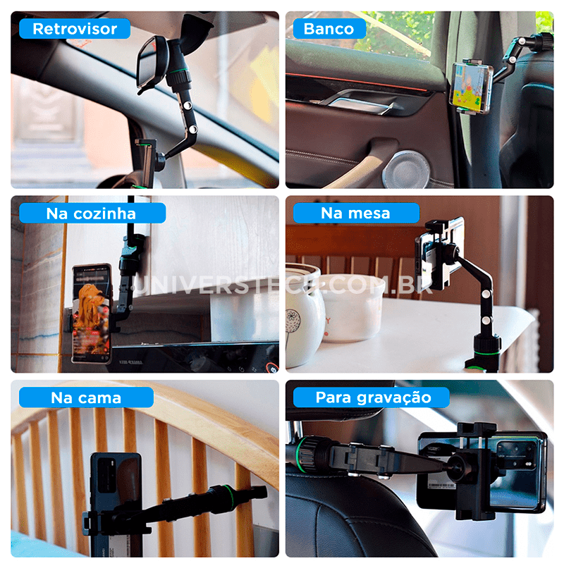 Compatível com todos os modelos de veículos e celulares. Também pode ser usado em ambientes como cozinha ou escritório para assistir vídeos ou estudar.